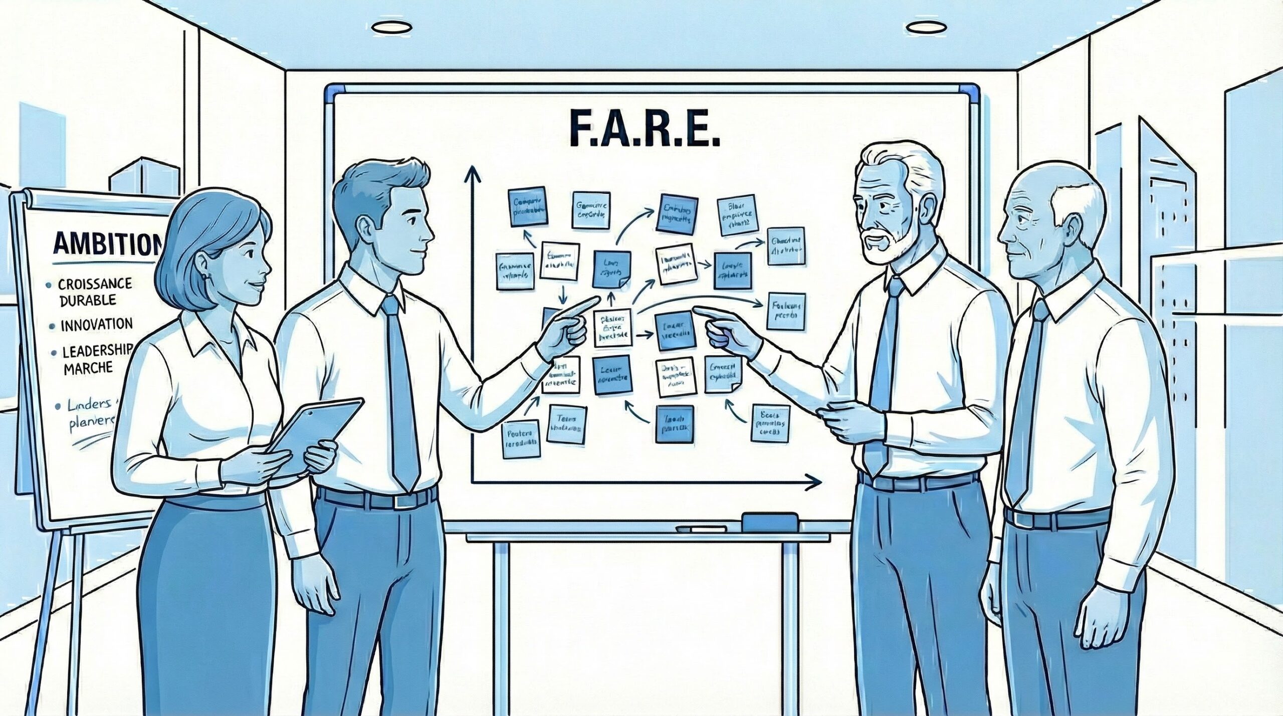 Nous traduisons votre ambition en une architecture de projets concrète, équilibrée entre la structuration de vos fondations internes et votre développement commercial. Chaque initiative est passée au crible de notre filtre de validation F.A.R.E. pour en garantir la faisabilité, la rentabilité et l’acceptabilité. Cette rigueur opérationnelle assure que votre organisation marche sur ses deux jambes, transformant les idées en une feuille de route solide.